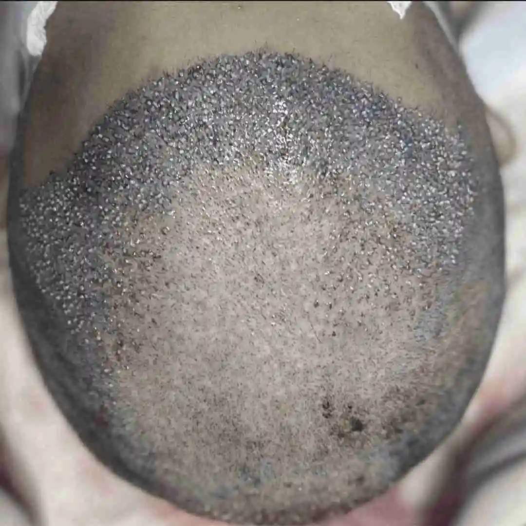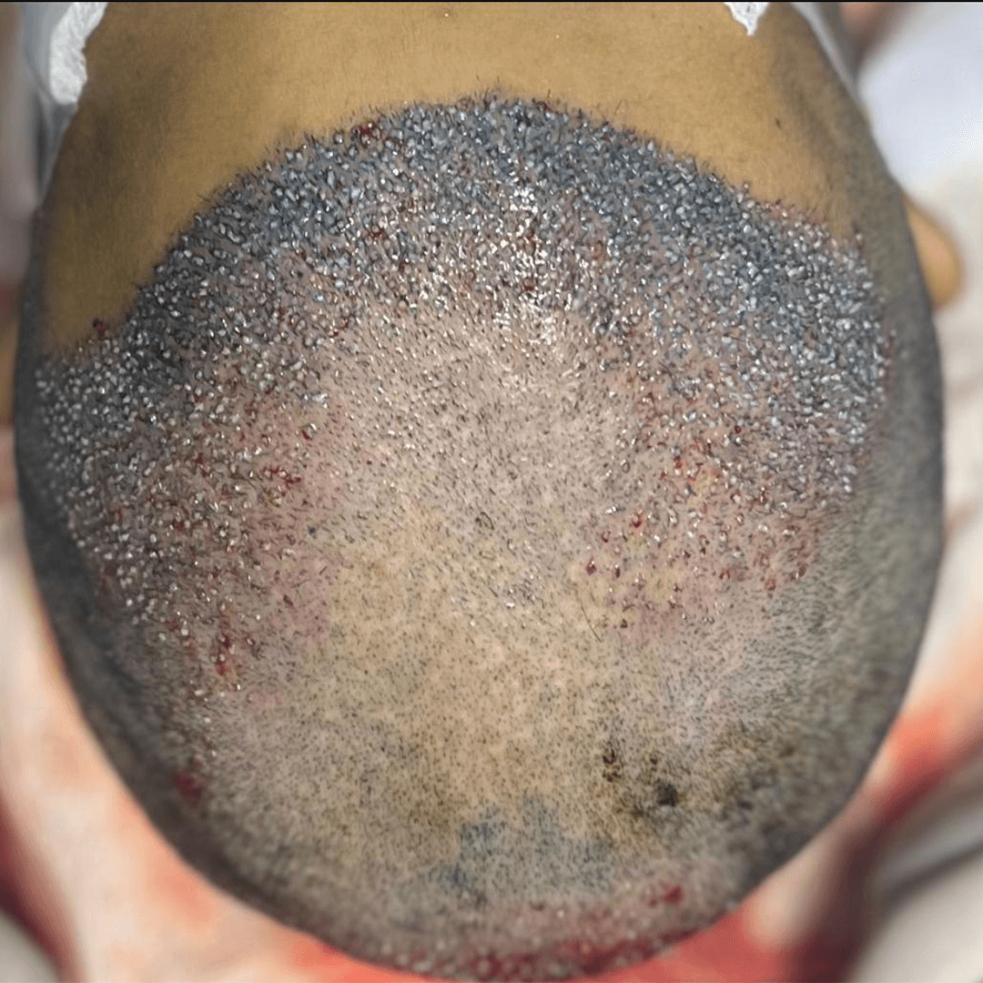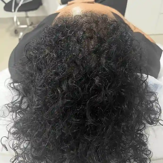 Paciente com alopecia androgenética avançada, que optou pelo transplante capilar utilizando a técnica FUE (extração de unidades foliculares). Foram implantados 6.920 folículos na região afetada.