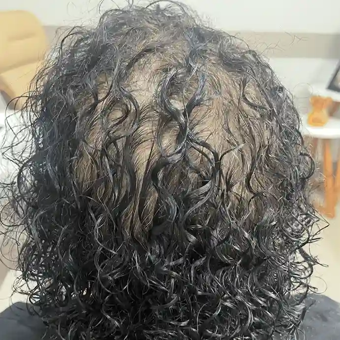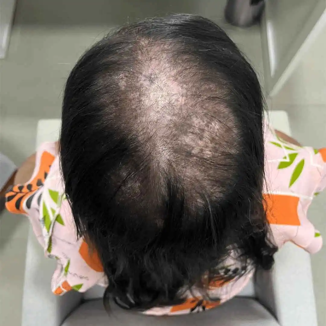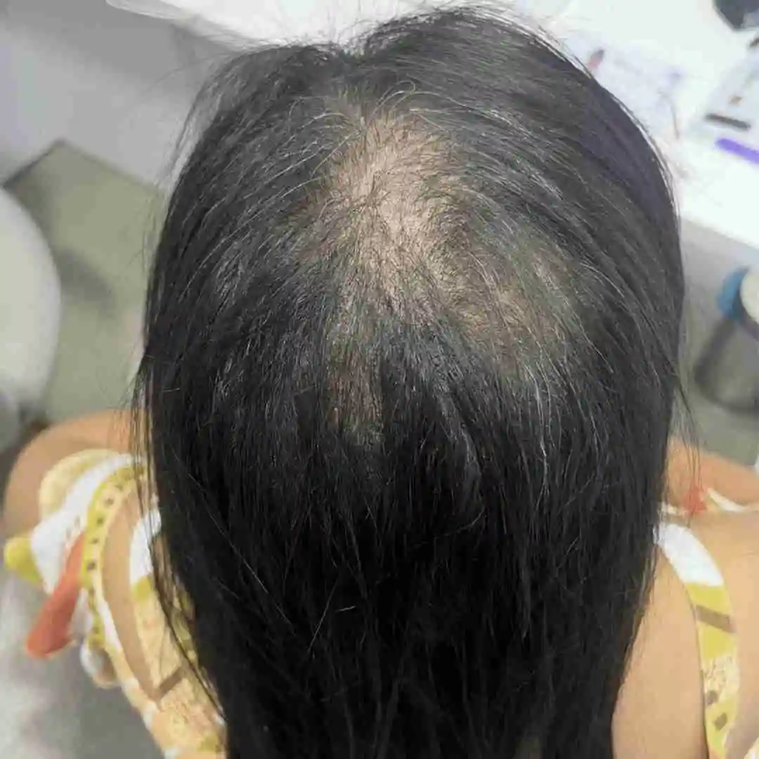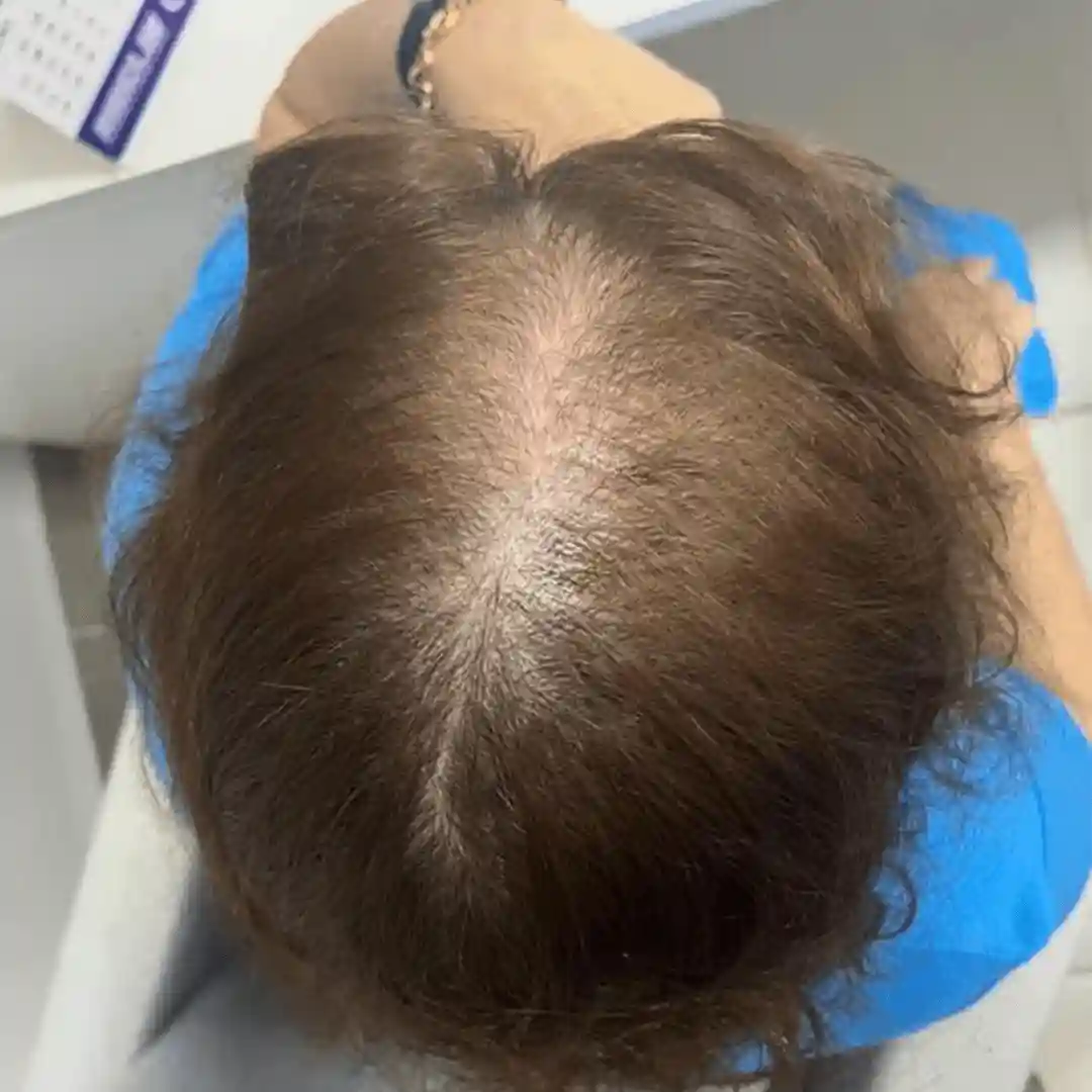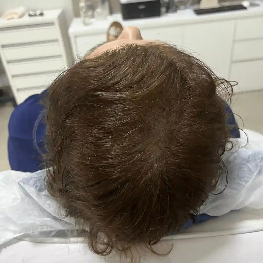 Paciente com queixa de queda capilar crônica, com piora importante no último ano. Após avaliação, foi diagnosticada com alopecia androgenética feminina, agravada por um quadro de eflúvio telógeno. Iniciou-se um protocolo de tratamento combinando terapia oral e aplicações injetáveis. Com 3 meses de evolução, já é possível notar melhora.